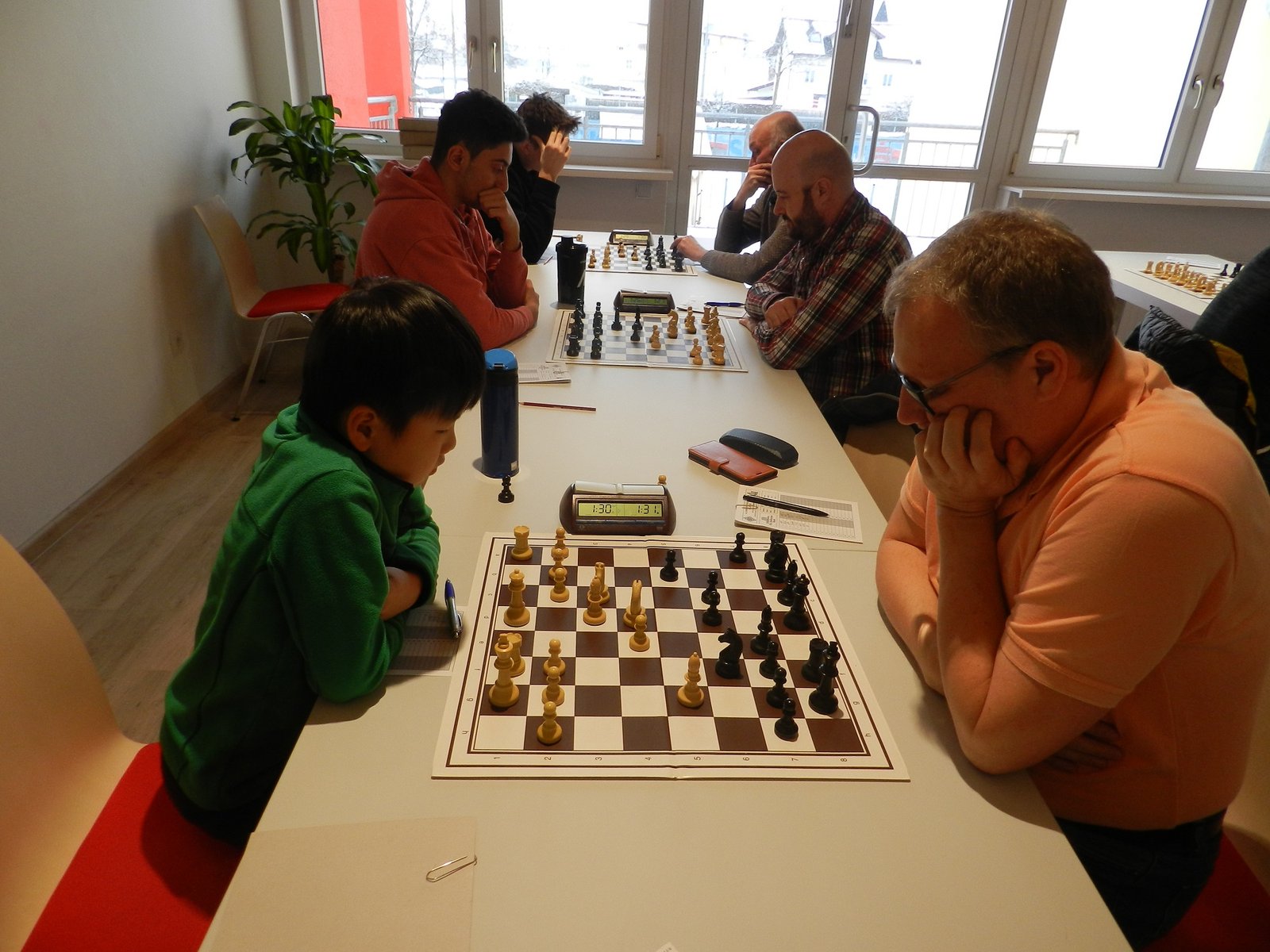 Arnold steht für unorthodoxe Eröffnungen, so hatten wir vor 4 Jahren auf dem Open etwa das Englund-Gambit auf dem Programm. Da ging es diesmal im Franzosen eher konventionell zu. Ich gewann einen Bauern, dafür hatte Arnold Aktivität. Ich tat was ich konnte um einige Figuren zu tauschen. Nach dem Doppelturmtausch bot mir Arnold remis, ebenfalls um den Sieg sicherzustellen. Noch während des Angebots verlor Boris, worauf ich weiterspielte. Zu meiner Überraschung tauschte er die Damen, doch was ich nicht gesehen hatte war dass plötzlich er einen aktiven Springer und König hatte und ich nicht, er hätte einfach rüberlaufen können und hätte mindestens einen Bauern gewonnen. Stattdessen machte er einen Zwischenzug h4, worauf ich mich mit dem König entgegenstellen konnte. Doch vorwärts kam ich nicht mehr, im Gegenteil musste eher ich aufpassen dass sein König nicht reinkam. Die Partie endete wenig später mit Zugwiederholung, mehr war nicht mehr drin, nun musste Christian gewinnen