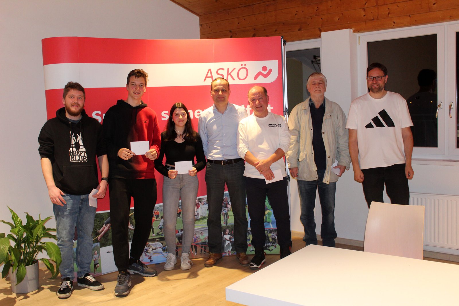Die Tagessieger von links nach rechts: Augustin Untersteiner (U 1700), Alexander Gschwandtl (U 1850), Magdalena Mörwald (U 2000), Juro Ljubic (Rang 3), Radoslav Panajotov (Tagessieger), IM Vladimir Hresc (Rang 2) und Schiedsrichter Florian Pöllner