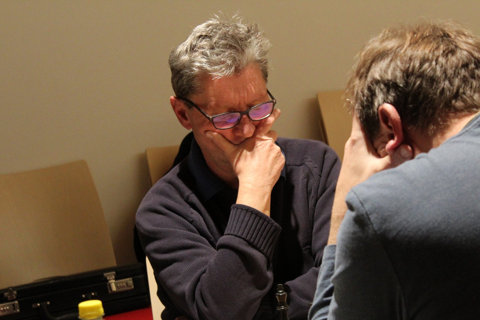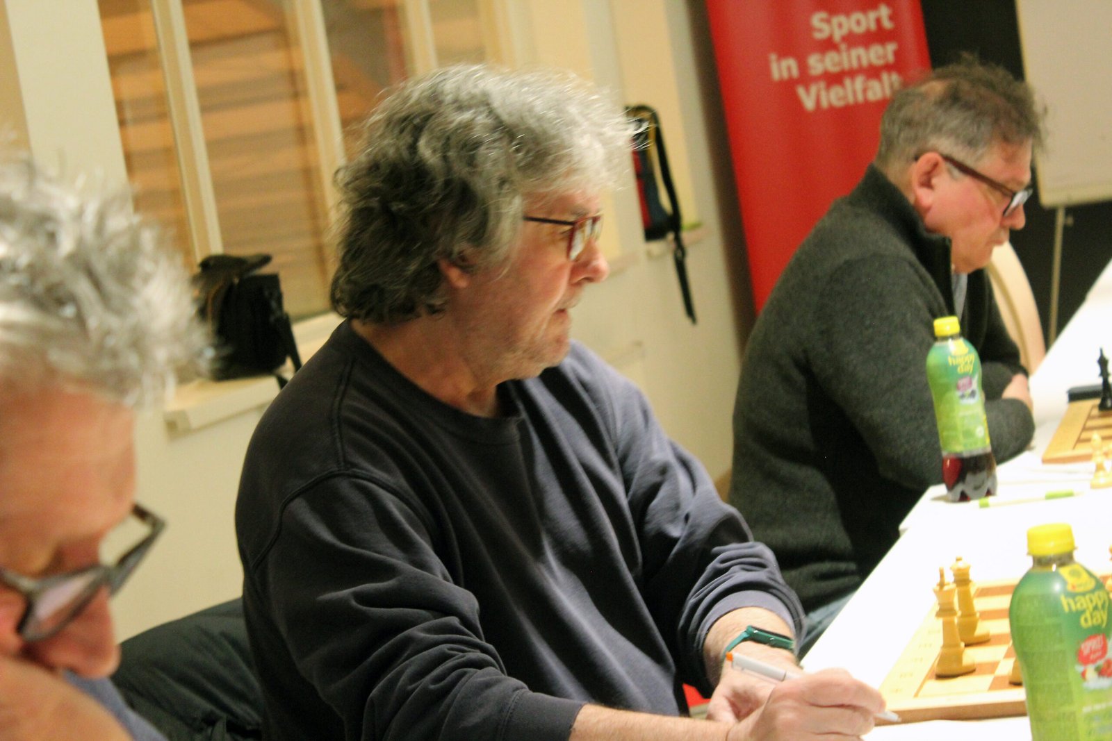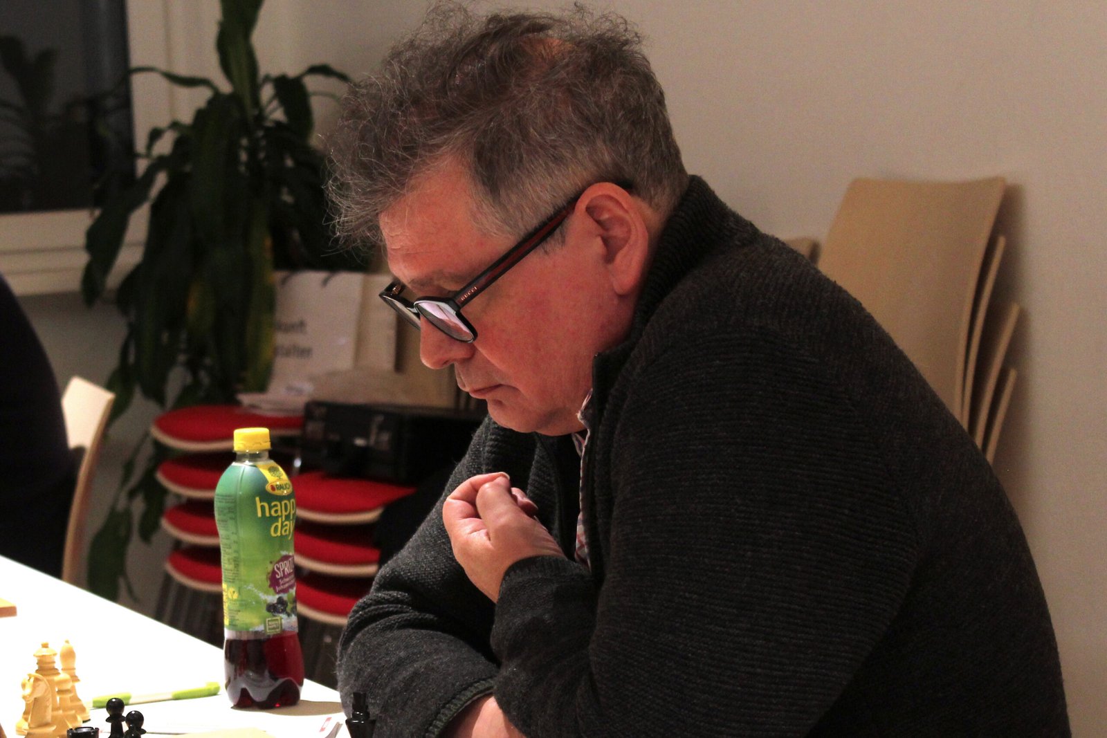 Spannend verlief die Partie von Walter Haselsteiner gegen Nedelko Lazarevic. Dieser griff am Königsflügel druckvoll an und Walter hatte Mühe die Drohungen abzuwehren. Nach einem Figurenopfer seines Gegners überlegte er kurz in Rücksprache mit Klaus, ob er das gleichzeitige Remis annehmen sollte, spielte aber dann die unklare Stellung weiter. Nach Abtausch erhielt er dann für Turm und Bauer zwei Läufer, die er sukzessive in den eigenen Angriff einbrachte und am Schluss mit einer schönen Kombination gegen den König von Nedelko zum Sieg finalisierte.