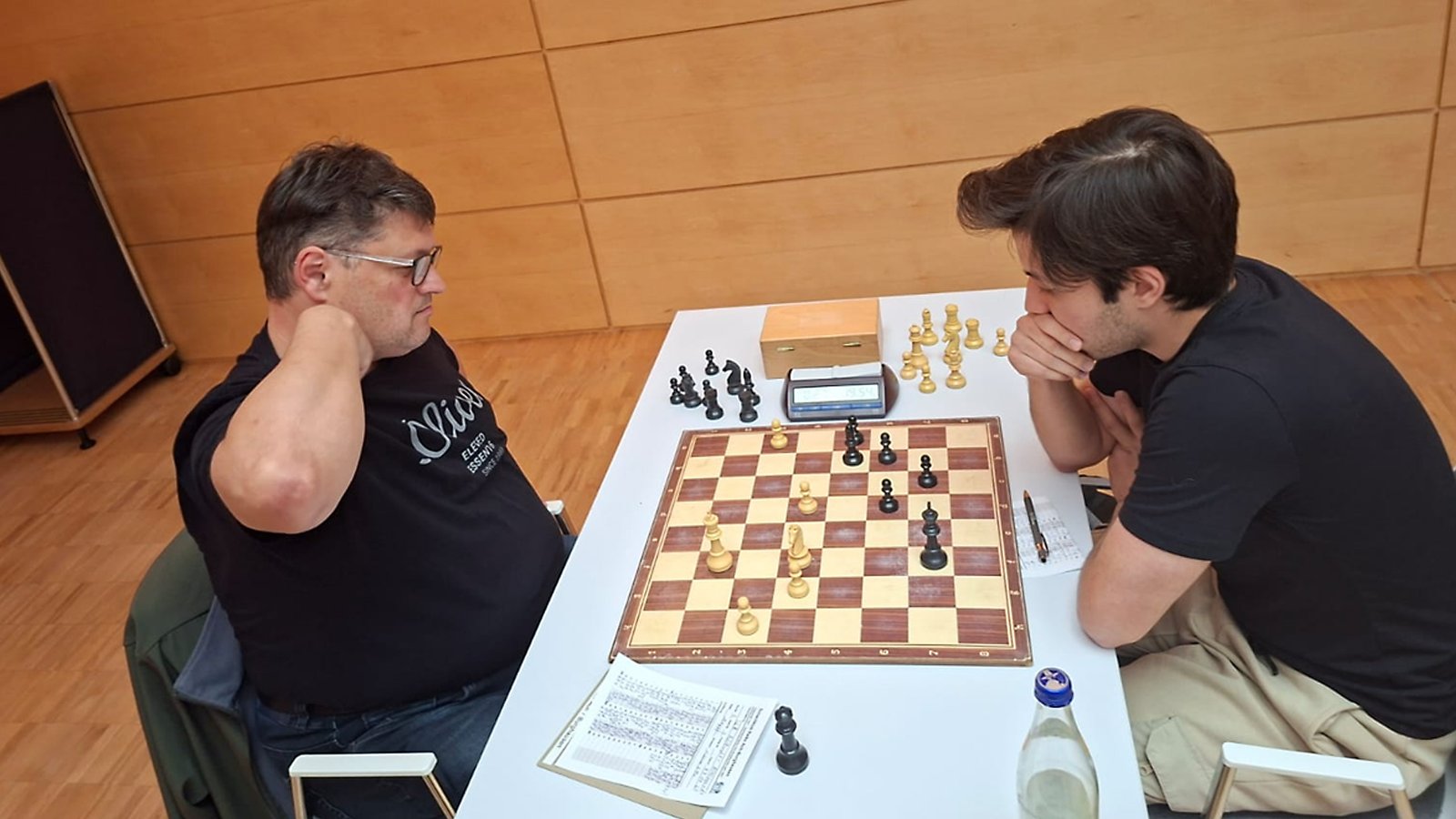 Eine extrem spannende Partie spielte Bieringer Konrad gegen Ahmad Hammami. In einer unorthodoxen Stellung konnte Ahmad Vorteile am Königsflügel erringen und einen Bauern bis g2 vorbringen. Allerdings konterte Konrad im Zentrum, beide Könige waren groß rochiert, und Konrad drohte sogar Matt oder Qualitätsgewinn. Aber Ahmad fand den einzigen Verteidigungszug und in weiterhin unklarer Stellung einigten sich beide auf Remis. Nun musste die letzte Partie den Mannschaftskampf entscheiden.