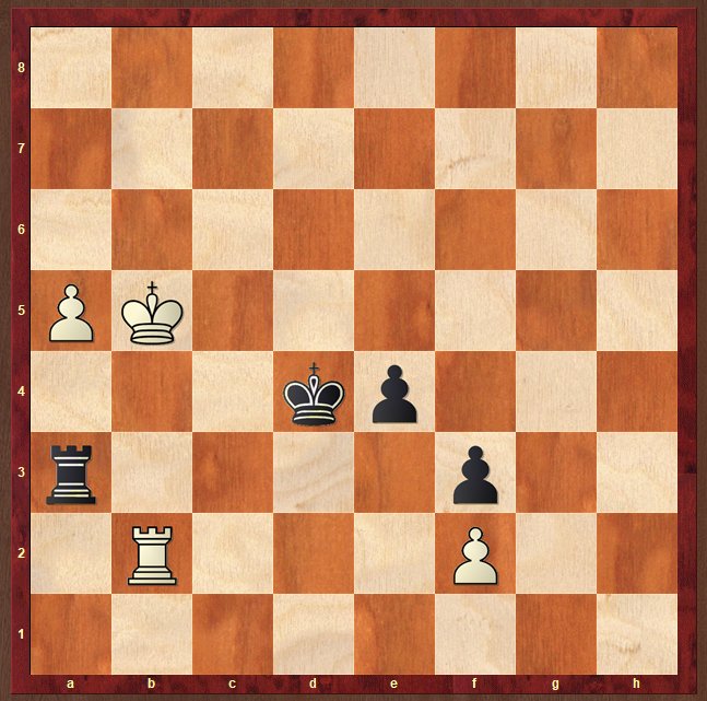 Bernhard Besner gestaltete die Partie von Anfang an offen und ausgeglichen, die Partie sollte über die volle Distanz gehen, nach der Zeitkontrolle im 40. Zug befand man sich in einem Turmendspiel mit 7 Bauern, in dem Bernie wegen des potentiell entfernten Freibauern nicht die Türme tauschen durfte. Fabian entschloss sich die Durchbrüche offenzuhalten. Nachdem Bernie seinen Turm lang langem hin und her auf der h-Linie aktiviert hatte wurde es dann dramatisch, Fabian hatte einen Freibauern auf der b-Linie installiert, während auf der Königsseite 2-1 auf den Linien e und f standen, die Bernie vorrückte, als er mit seinem König den weißen Turm angriff ging der Turm überraschend nach b2, was folgendes Diagramm ergibt.