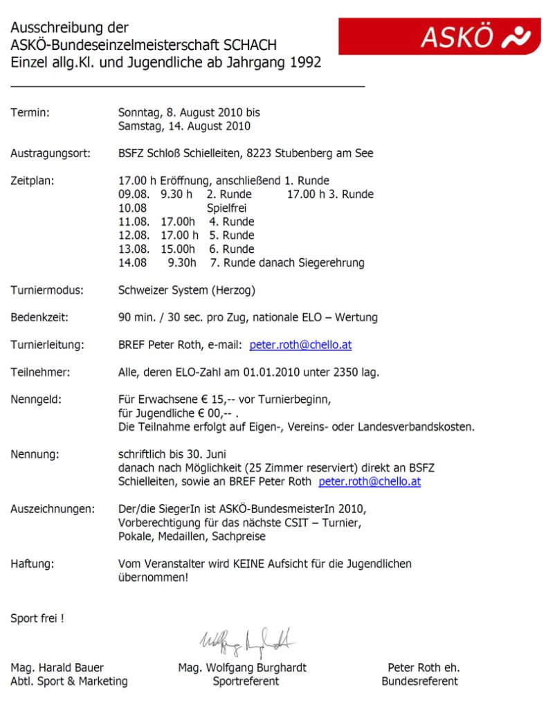 Bernhard Besner gewinnt den ASK Sommercup 2010 Insgesamt 31 Teilnehmer stellten sich den sommerlichen Herausforderungen am Schachbrett. Von den 5 […]