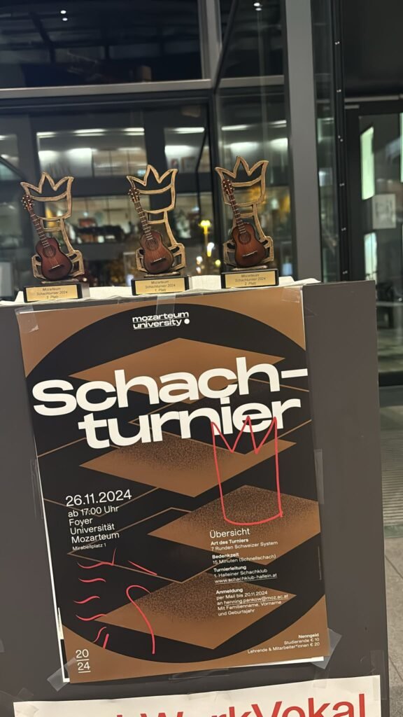 Am 26. November 2024 veranstaltete das Salzburger Mozarteum in Zusammenarbeit mit dem Schachklub Hallein das 2. Mozarteum Turnier. Gespielt wurden
